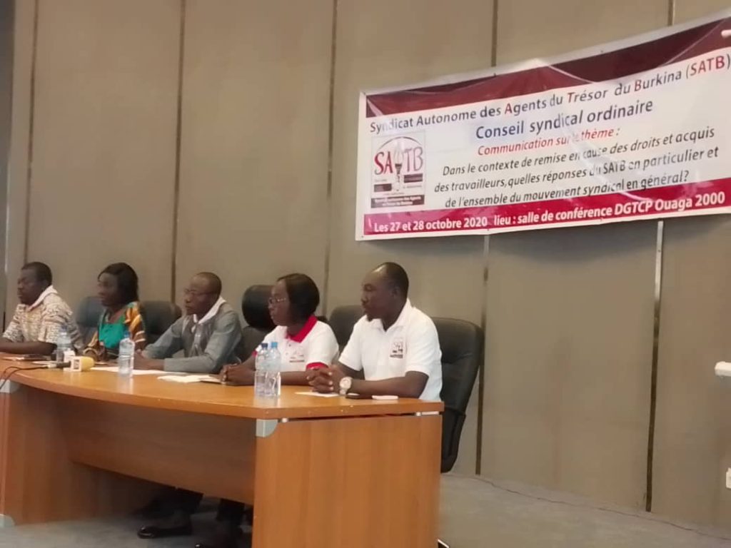 Le Syndicat autonome des agents du trésor du Burkina (SATB) a tenu son 9e conseil ordinaire du 27 au 28 octobre de 2020. Il s’est agi pour les syndicalistes de faire le bilan de ses activités, et de faire des projections sur les actions à mener et adopter des résolutions du conseil.
