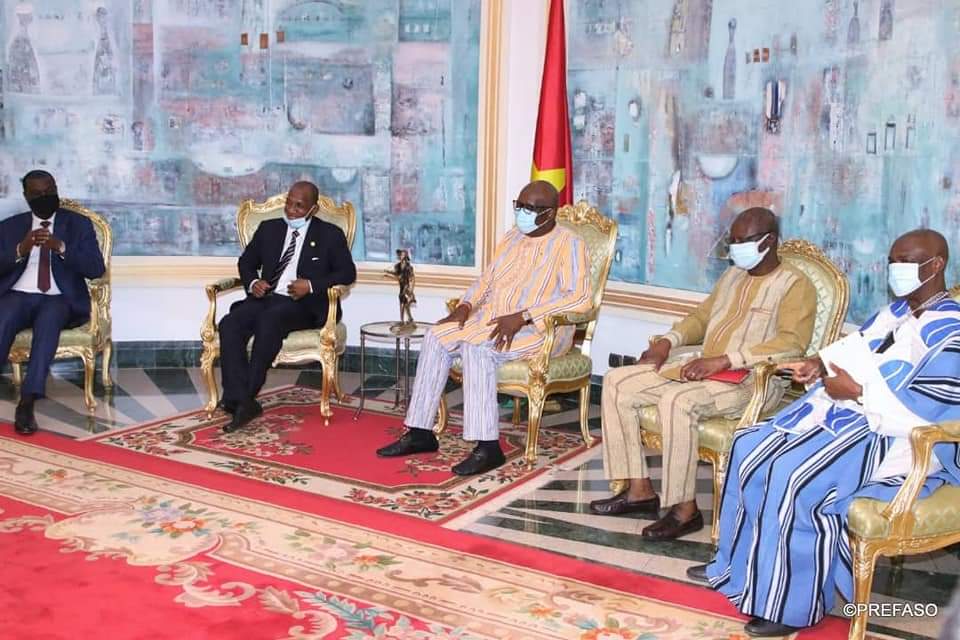 (Ouagadougou, 23 novembre 2020). Le président du Faso, Roch Marc Christian Kaboré, a reçu en audience ce lundi en milieu de matinée, la mission d’observation des élections, de la Commission économique des Etats de l’Afrique de l’Ouest (CEDEAO), conduite par l’ancien Premier ministre de Guinée Conakry, Kabiné Komara. La délégation est venue féliciter le président Kaboré et toute la classe politique burkinabè, pour le bon déroulement des élections.