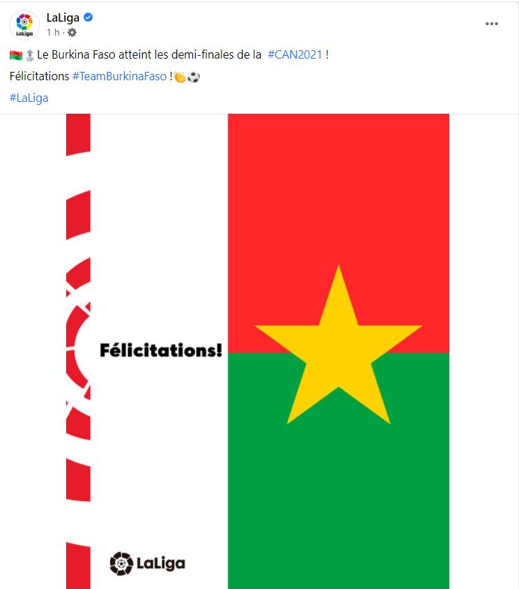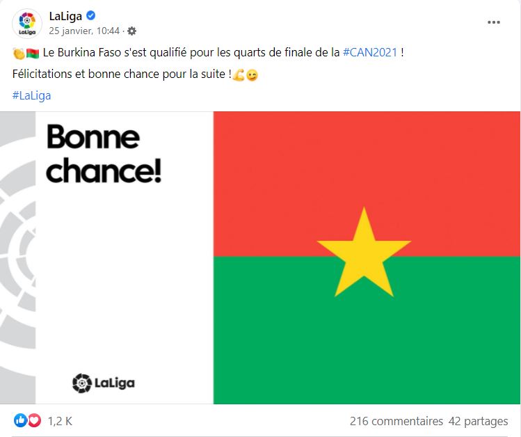 Alors que le Burkina Faso fait son bonhomme de chemin à la CAN 2021, les soutiens viennent de partout. Depuis le début de la compétition, la Liga le championnat espagnol a clairement affiché son soutien aux Etalons à travers sa page Facebook.