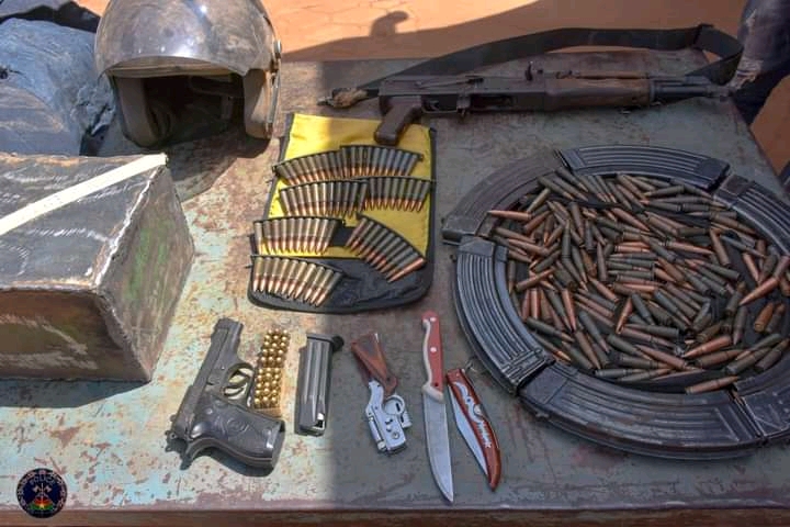 Cette opération a permis la saisie des mains des présumés malfrats, une kalachnikov, un pistolet automatique, près de quatre cent (400) munitions, une dizaine d’engins à deux (02) roues, un sac contenant deux (02) lots de papiers noirs en forme de billets de banque dont l’un en coupure de 10.000 FCFA équivalent à 150.000.000 FCFA et l’autre en coupure d’Euros équivalent à 7.000.000 d’Euros, des armes blanches et divers autres objets.