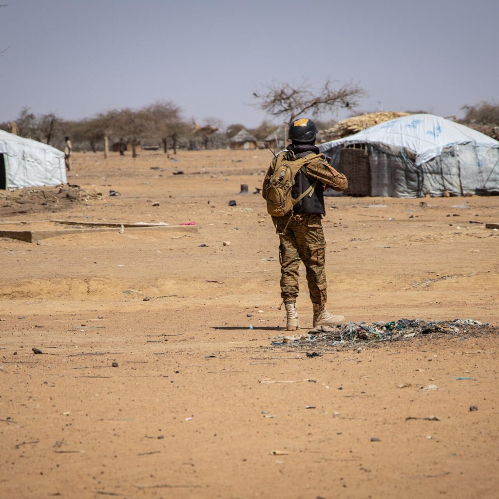 A Burkina Faso soldier patrols at the Goudebo refugee camp for Malian refugees, in Dori, on February 3, 2020. - More than 8 000 Malian refugees live in the Goudebo camp. (Photo by OLYMPIA DE MAISMONT / AFP) / “The erroneous mention[s] appearing in the metadata of this photo by OLYMPIA DE MAISMONT has been modified in AFP systems in the following manner: [A Burkina Faso soldier patrols at the Goudebo refugee camp for Malian refugees, in Dori, on February 3, 2020. More than 8 000 Malian refugees live in the Goudebo camp. ] instead of [A Burkina Faso soldier patrols at a camp sheltering Internally Displaced People (IDP) from Mali in Dori, on February 3, 2020. 600 000 Internally Displaced People (IDP) have fled recent attacks in northern Burkina Faso.]. Please immediately remove the erroneous mention[s] from all your online services and delete it (them) from your servers. If you have been authorized by AFP to distribute it (them) to third parties, please ensure that the same actions are carried out by them. Failure to promptly comply with these instructions will entail liability on your part for any continued or post notification usage. Therefore we thank you very much for all your attention and prompt action. We are sorry for the inconvenience this notification may cause and remain at your disposal for any further information you may require.”
