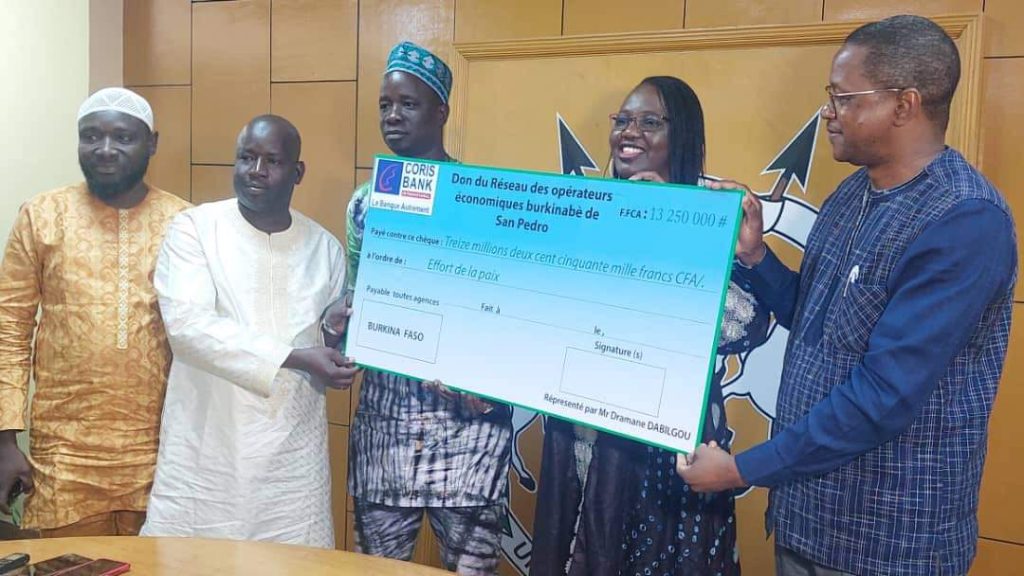 La diaspora burkinabè à Bangui en République Centrafricaine, a remis un chèque de 12 millions de francs CFA. Les opérateurs économiques burkinabè vivants à San Pedro en République de Côte d’Ivoire ont transmis un chèque de 13.250.000.