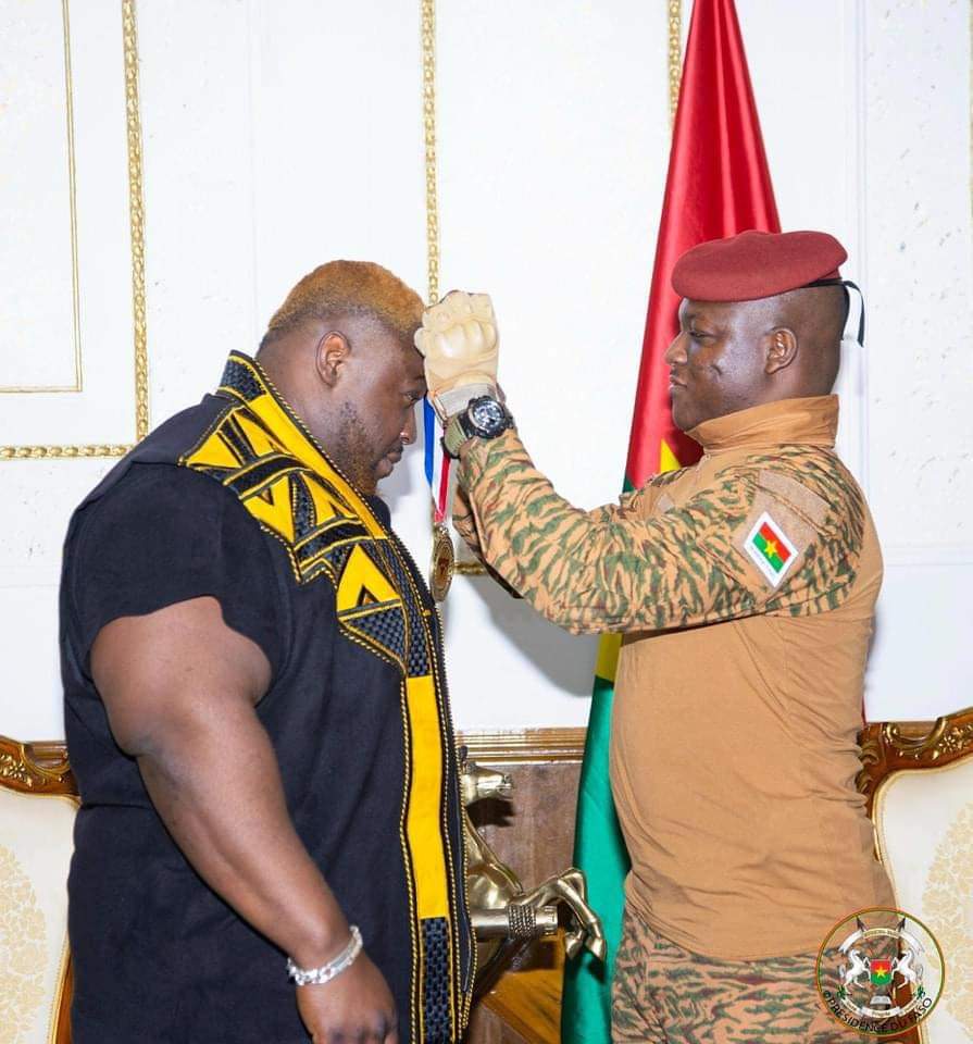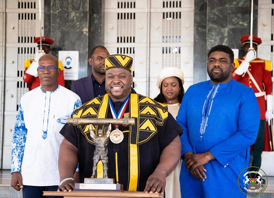 Le burkinabè Iron Biby, de son vrai nom Cheick Ahmed Al-Hassan SANOU, champion du monde de log lift, a été fait, ce lundi 13 novembre 2023, Officier de l’Ordre de l’Étalon par le Chef de l’État, le Capitaine Ibrahim TRAORE.