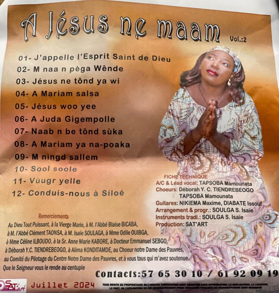 La musicienne burkinabè Viviane, à l’état civil Mamounata Tapsoba, a officiellement dédicacé son deuxième album intitulé « A Jésus ne maam » (« Jésus et moi » en français), ce dimanche 14 juillet au Centre National des Arts, du Spectacle et de l’Audiovisuel (CENASA).