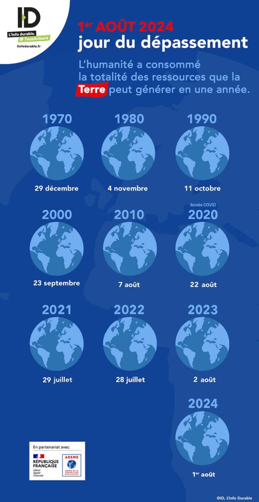 Du 1er janvier 2024 au 1er août 2024, l’ensemble des habitants de la terre a consommé tout ce que la planète peut régénérer en une année. Ce qui veut dire que du 1er août au 1er décembre, tout ce que nous consommons est peut-être ce qui aurait pu être régénéré en 2025. Nous consommons actuellement des choses à crédit. Ce n’est pas la première fois que cela arrive, il y a chaque année des jours de dépassement. Les populations consomment l’ensemble des ressources que la terre peut régénérer en une année plusieurs fois, ce qui veut dire qu’on consomme ce qui appartient aux générations futures et au-delà de ça, nous ne leur permettons pas de retrouver un environnement équilibré, de retrouver des ressources diversifiées avec la biodiversité. Avec ses dépassements, nous consommons la nourriture des générations futures.