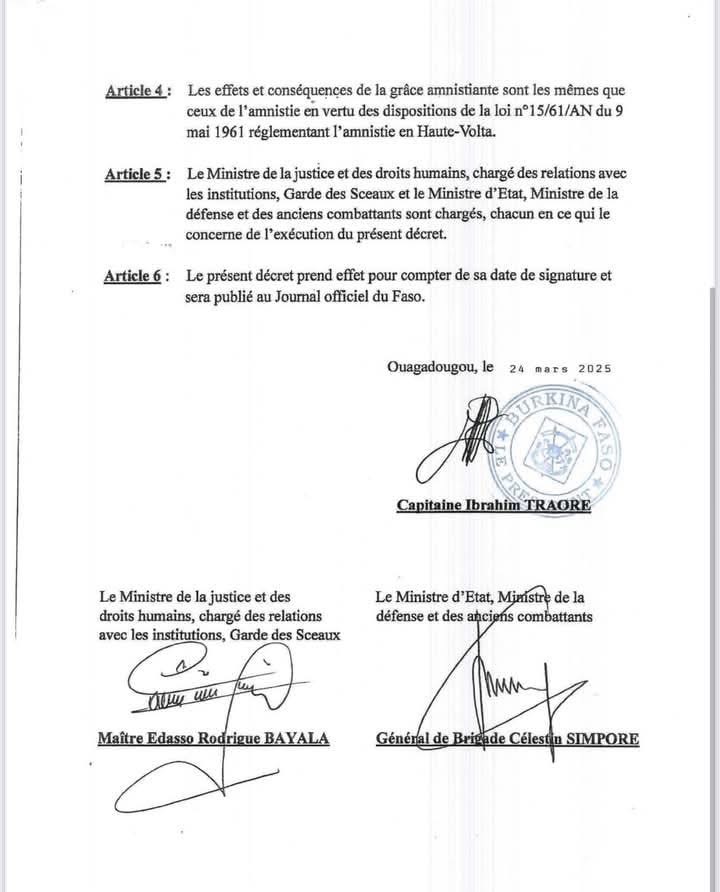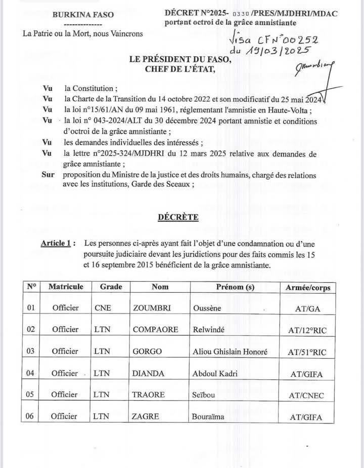 Dans un décret en date du 24 mars 2025, le Chef de l’État, le Capitaine Ibrahim Traoré, accorde une “grâce amnistiante” à 21 membres des Forces armées nationales. Selon le ce décret, cette mesure concerne les personnes condamnées ou poursuivies devant la justice pour des faits liés aux événements des 15 et 16 septembre 2015, période marquée par le coup d’État du général Gilbert Diendéré et de l’ex-Régiment de sécurité présidentielle (RSP) contre le régime de transition dirigé par Michel Kafando.