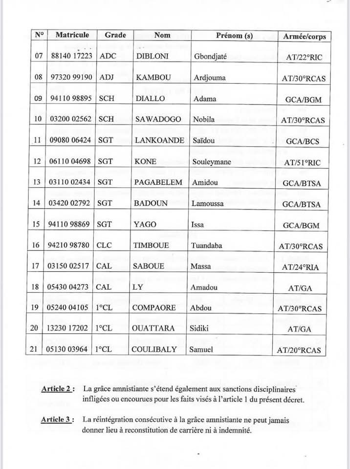 Avec cette mesure, les autorités de transition poursuivent leur volonté de tourner la page des crises politiques passées, tout en favorisant une certaine réconciliation au sein des forces de défense et de sécurité du pays.
