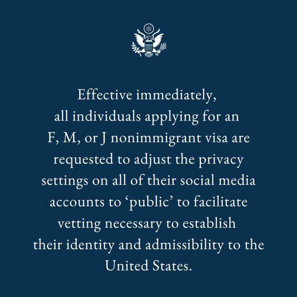« Désormais, toutes les personnes demandant un visa non-immigrant F, M ou J sont priées de modifier les paramètres de confidentialité de tous leurs comptes de réseaux sociaux en les rendant « publics », afin de faciliter les vérifications nécessaires à l’établissement de leur identité et de leur admissibilité aux États-Unis en vertu de la législation américaine », a indiqué lundi l’ambassade des États-Unis dans un communiqué.