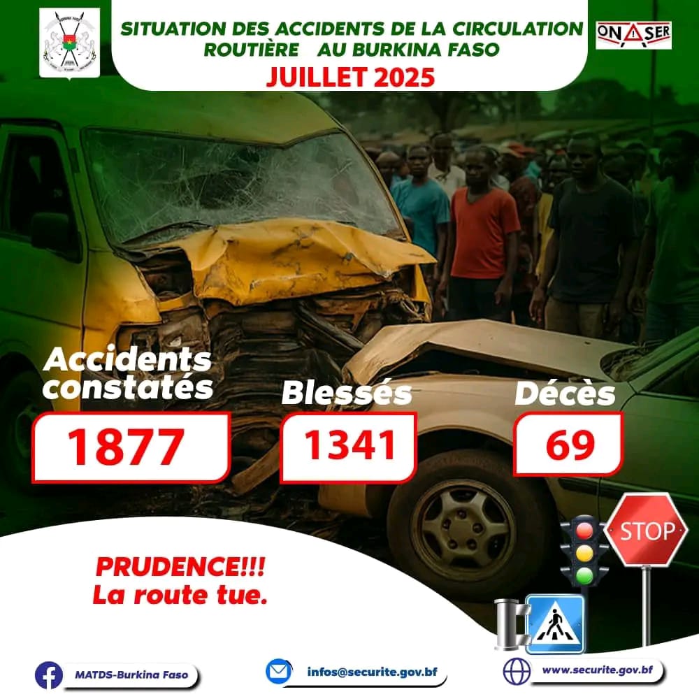 Durant le mois de juillet 2025, les données collectées font état de 1 877 accidents de la circulation, ayant occasionné 1 341 blessés et 69 décès. Par rapport au mois précédent, l’on note une réduction significative du nombre de décès estimée à 8 %.